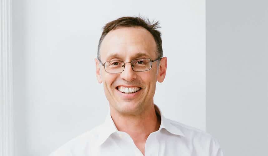 Man wearing glasses, smiling, in a blue shirt and brown blazer against a dark background.
